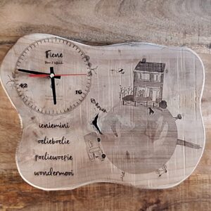 Wij maken onze afklopartikelen met CNC frees- en lasertechniek en fabriceren veel verschillende artikelen, zoals sleutelhangers (zodat je ook onderweg kunt afkloppen), klokken, geboorteplankjes en -klokken, tekstborden, een uitgesneden skyline van je favoriete stad of dorp. De producten zijn allemaal handgemaakt en kunnen dus wat afwijken van de foto’s. Wij wijzen je erop dat hout een natuurlijk materiaal is dat altijd nog wat kan gaan werken.
